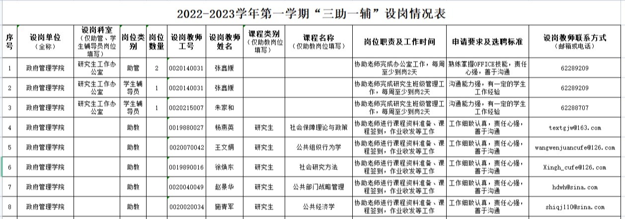 bat365中文官方网站2022-2023学年第一学期“三助一辅”设岗情况表