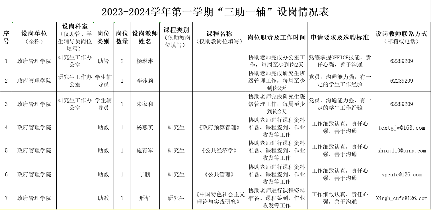bat365中文官方网站2023-2024学年第一学期“三助一辅”设岗情况表