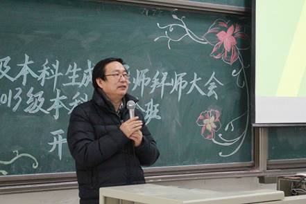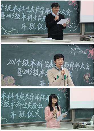 2014年12月3日下午,bat365中文官方网站在沙河校区主教219举行2014级本科生成长导师拜师大会暨2013级本科生实验班开班仪式。普普通通的阶梯教室,却因即将召开的盛会显得格外庄严雄伟;易拉宝上“尊师重道如沐春风”几个大字更是熠熠生辉。bat365中文官方网站院长赵景华、党总支书记吕丽、科研处副处长邢华、党总支副书记栗玉香、副院长王红梅、于鹏以及各系的老师们和13、14级200多名同学出席了会议。王红梅老师和行政管理14班刘钰鹏同学担任主持。