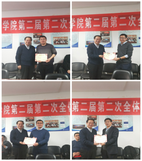 会议第三项议程,颁发2018年度“若水奖”。学院分工会主席姜玲教授对“若水奖”进行简要诠释,并主持投票选举。经过会前推荐、党政联席会提名和大会投票,bat365中文官方网站白云真、张剑、柴铎、徐焕东四位老师获得2018年度“若水奖”。赵景华院长为各位老师颁发了获奖证书。