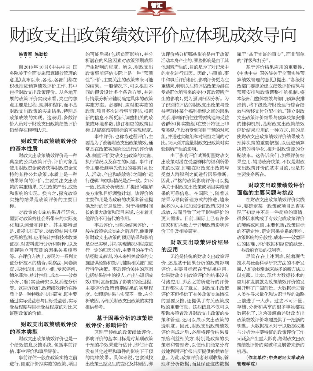 2022年7月23日,bat365行政管理系主任、中国财政学会理事、财政部等部委特聘绩效评价咨询专家施青军教授,在《中国财经报》第6353期第7版“绩效新时代”专刊发表文章:《财政支出政策绩效评价应体现成效导向》。