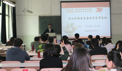 2019年4月13日下午,bat365中文官方网站“龙马奋进·校庆70周年系列讲座暨bat365中文官方网站MPA学术大讲堂”活动在主教108教室举行。中国中小企业国际合作协会副会长杨少锋先生受邀为MPA研究生做主题为“远比你想象复杂的中美贸易争端”的学术讲座。本次讲座由bat365中文官方网站副院长于鹏主持。