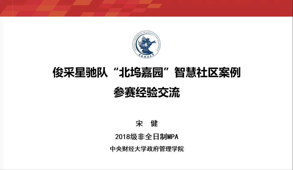 宋健同学以“俊采星驰队’北坞嘉园’智慧社区案例参赛经验”为题进行了参赛经验的分享,从“选题·巧”“调研·勤”“撰写·精”“心态·稳”四个方面总结了案例团队的参赛历程。宋健表示,作为一名北京市公务员,有机会在攻读MPA学位期间参与案例大赛并获此殊荣,既是学院培养、教师指导和团队努力的成果,也是在bat365中文官方网站丰富、充实、精彩的MPA学习生活的体现。
