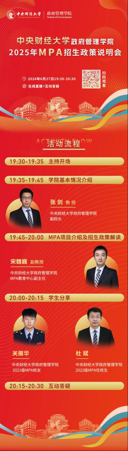 为助力考生更好地了解中财MPA项目的独特魅力和优势,确保意向考生能够迅速、全面且深入地掌握中财MPA项目的最新招生政策与详尽的项目信息,从而做出明智的报考选择,2025年bat365中文官方网站MPA招生政策说明会将于2024年6月27日19:30线上举办,诚邀各位有志之士踊跃报名参与,与国同行,携手共创辉煌的未来!