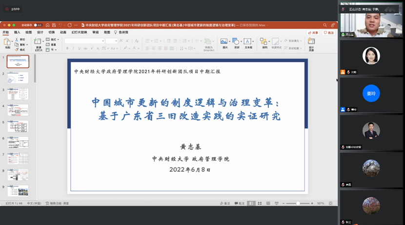 第二名汇报人黄志基副教授团队的研究的课题为中国城市更新的制度逻辑与治理变革:基于广东省三旧改造实践的实证研究。该课题以“城市更新行动”国家战略的提出为背景,以广东省三旧改造为研究对象和典型区域案例,系统研究中国城市更新的制度逻辑与治理变革。团队已完成对制度逻辑的梳理、典型案例的剖析、治理变革的探析、实施效应的评估共计17项研究,完成课题中期研究报告,培育课题项目5项,已发表论文2篇,共有1项成果获得采纳。随后黄志基副教授介绍了团队下一年的工作计划,并就未来关注的研究方向做了展望。