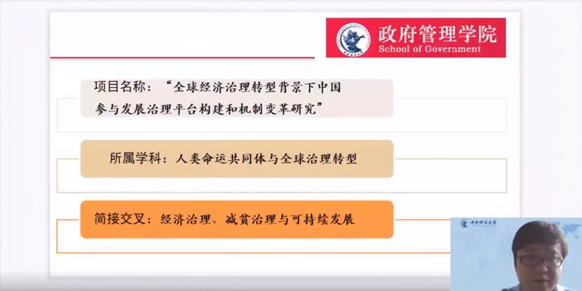 最后一名汇报人张鹏副教授介绍了其团队的研究课题——全球经济治理转型背景下中国参与发展治理平台构建和机制变革研究的阶段性进展。目前团队共计主持或参与国家及省部级科研项目10项,发表A类以上论文8篇,出版著作6部。随后张鹏副教授就选题背景、研究初步进展及努力方向做了详细的阐述。