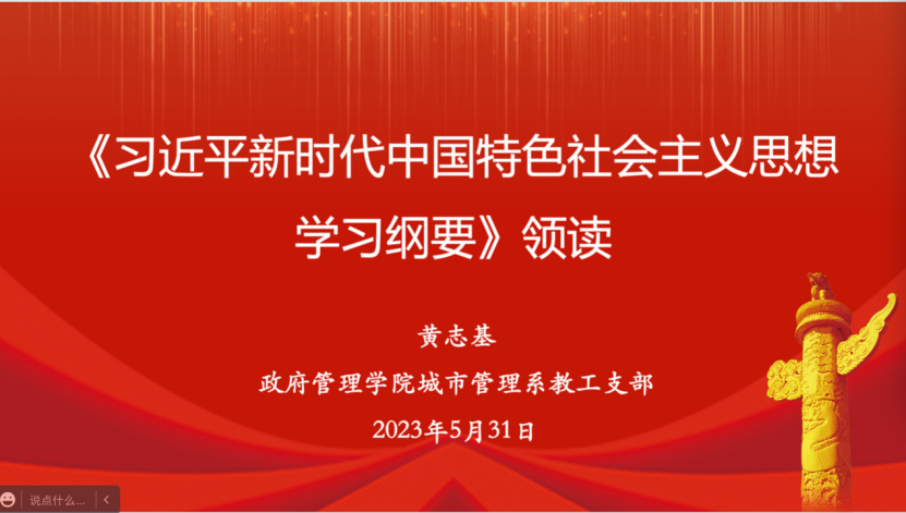 2023年5月31日中午12:30,bat365中文官方网站城市管理系教工党支部在线上开展《习近平新时代中国特色社会主义思想学习纲要》专题学习活动。支部书记陈红霞老师主持会议,支部委员黄志基老师主讲。
