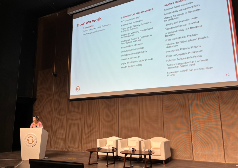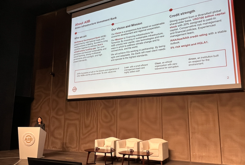 我校校友、现就任于亚投行政策战略与预算局的政策战略官陈晓朦女士首先指出亚投行与常规的商业银行不同,亚投行专注于“发展”,并不像商业银行一样追求尽可能高的利润;同时,与其他多边开发银行不同,亚投行专注于亚洲发展,致力于推进绿色、科技赋能的基础设施建设。陈晓朦女士也对投资项目类型、项目运行作了细致的介绍。